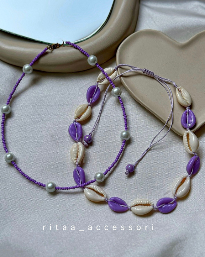 / گردنبندصدف / گردنبند منجوق و مروارید / گردنبند فیمو بنفش