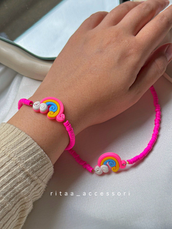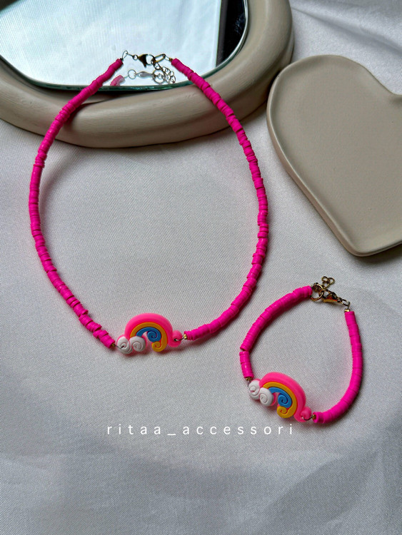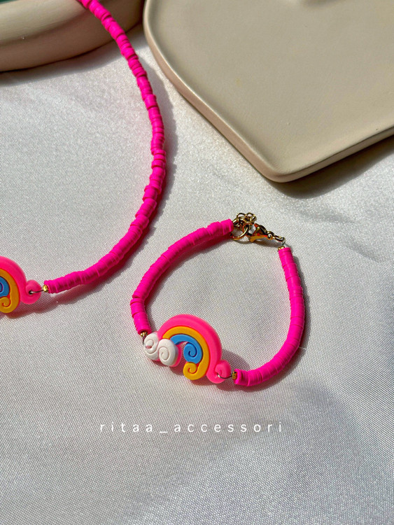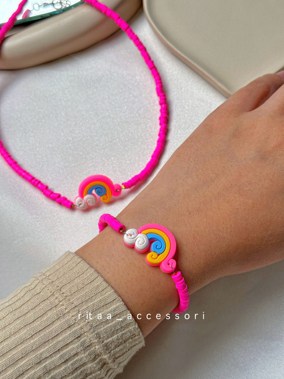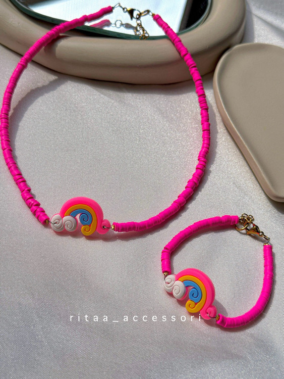 گردنبند و دستبند فیمو صورتی مدل رنگین کمان